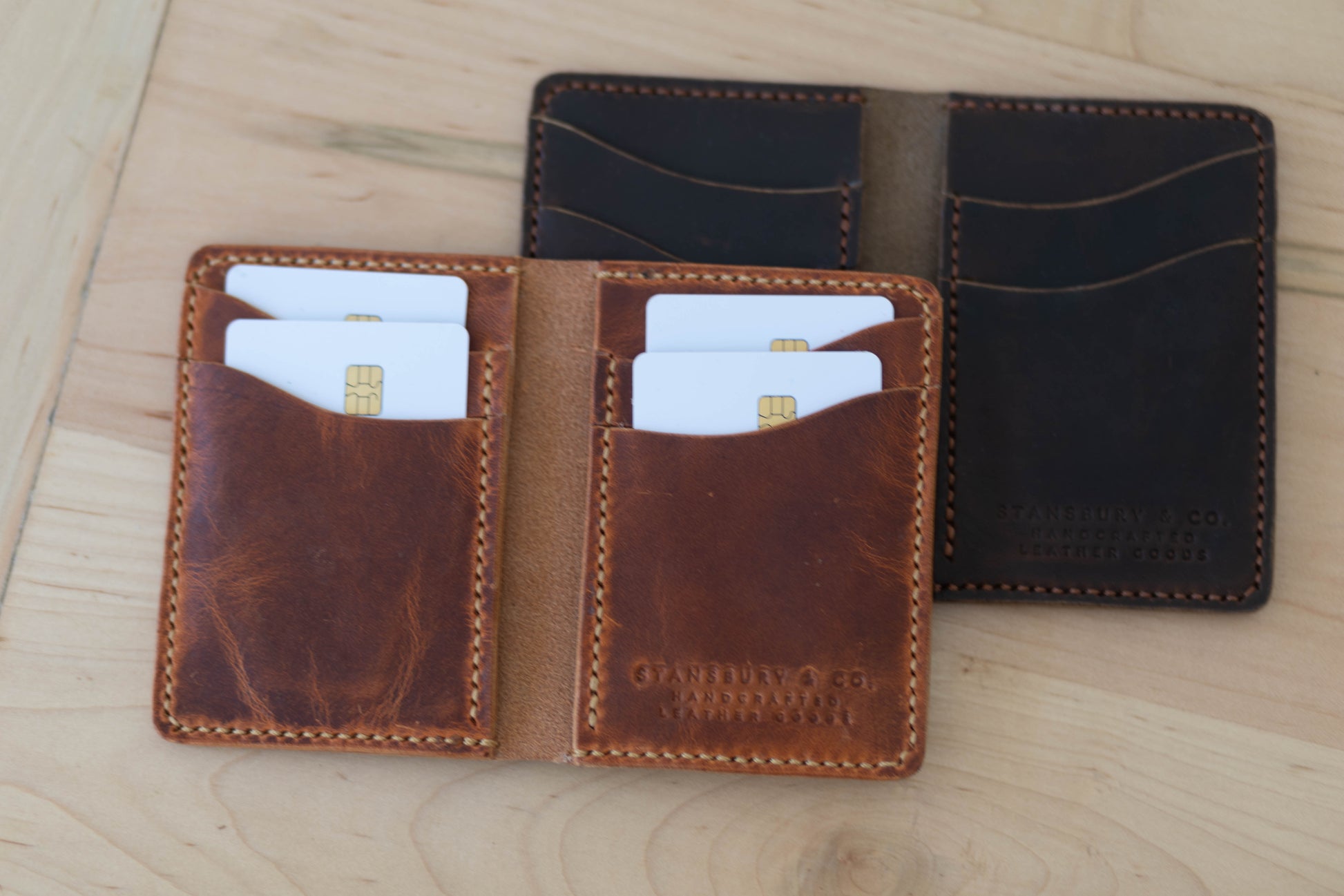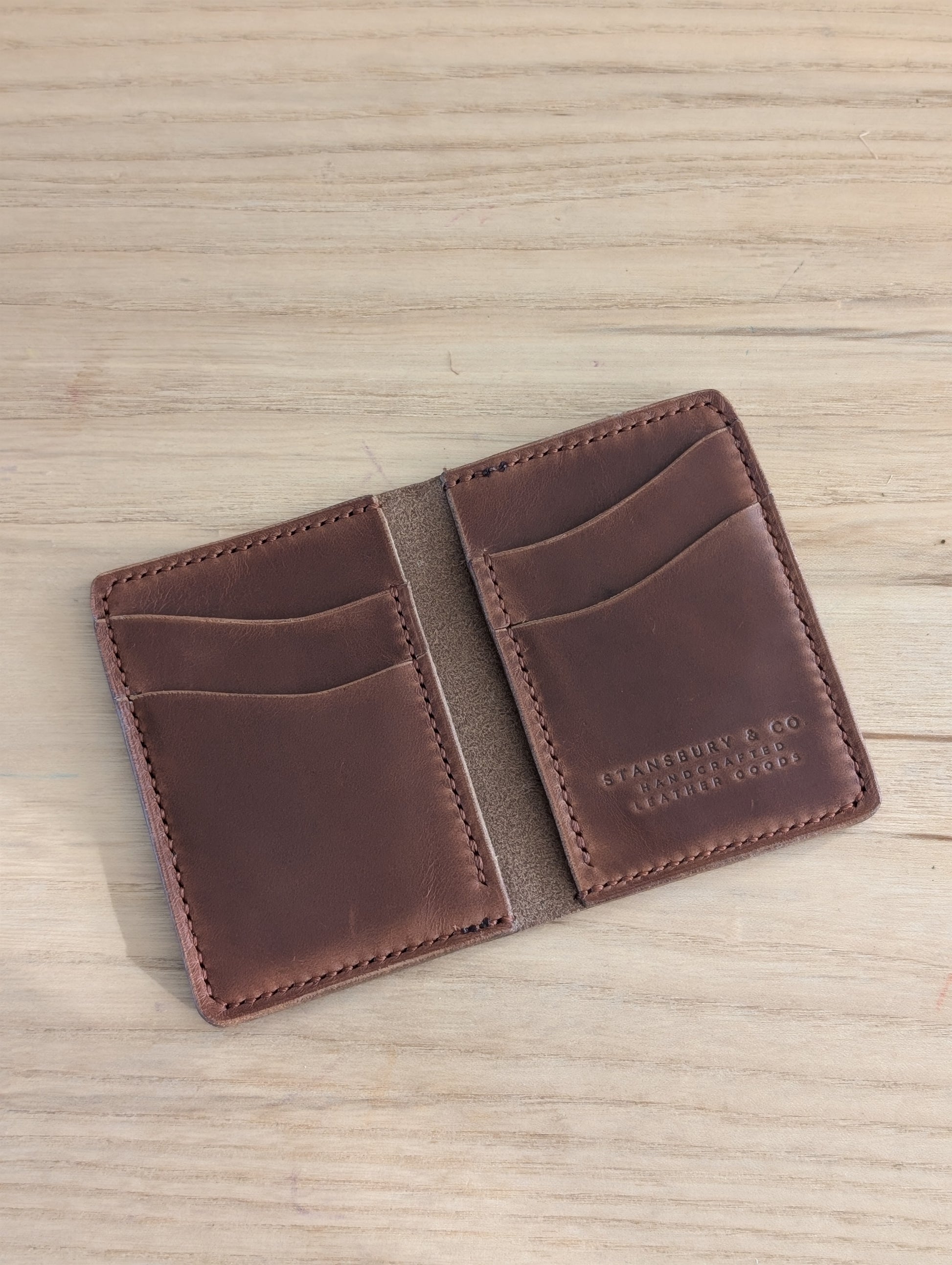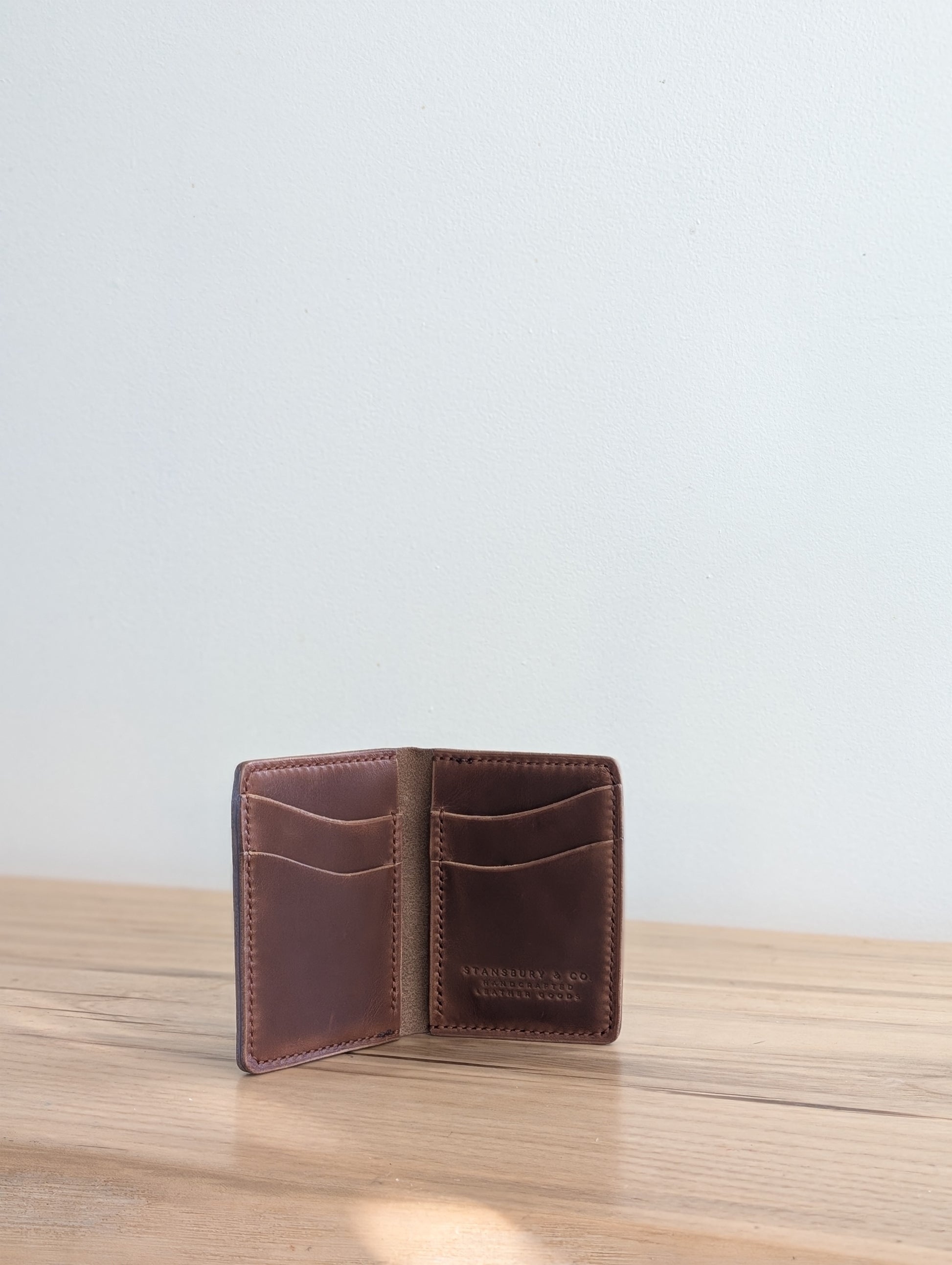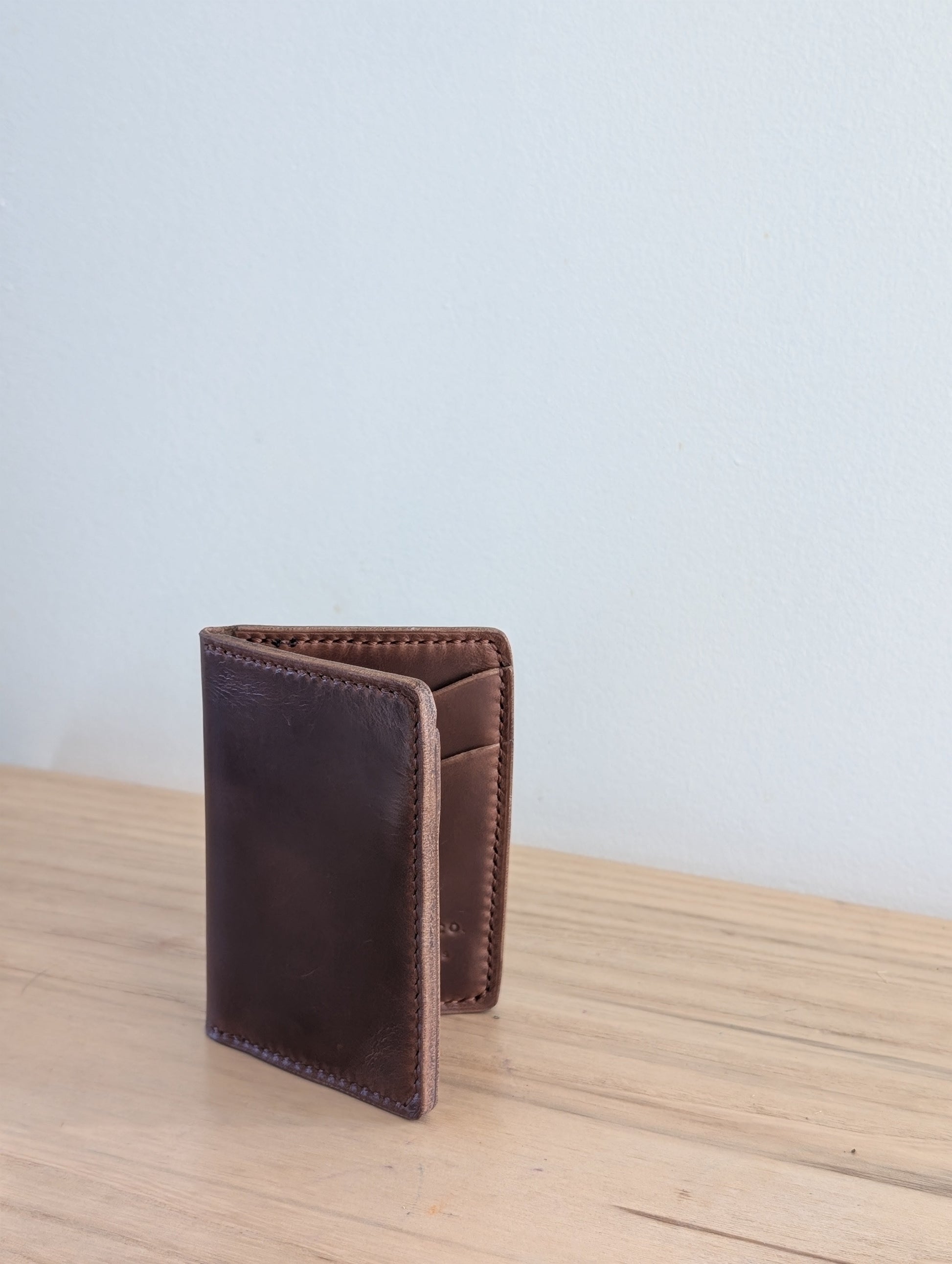 This is our Card Carrying Wallet. With 4 slots and 2 interior pockets for a few bills, this wallet has the maximum carrying capacity without the bulk.