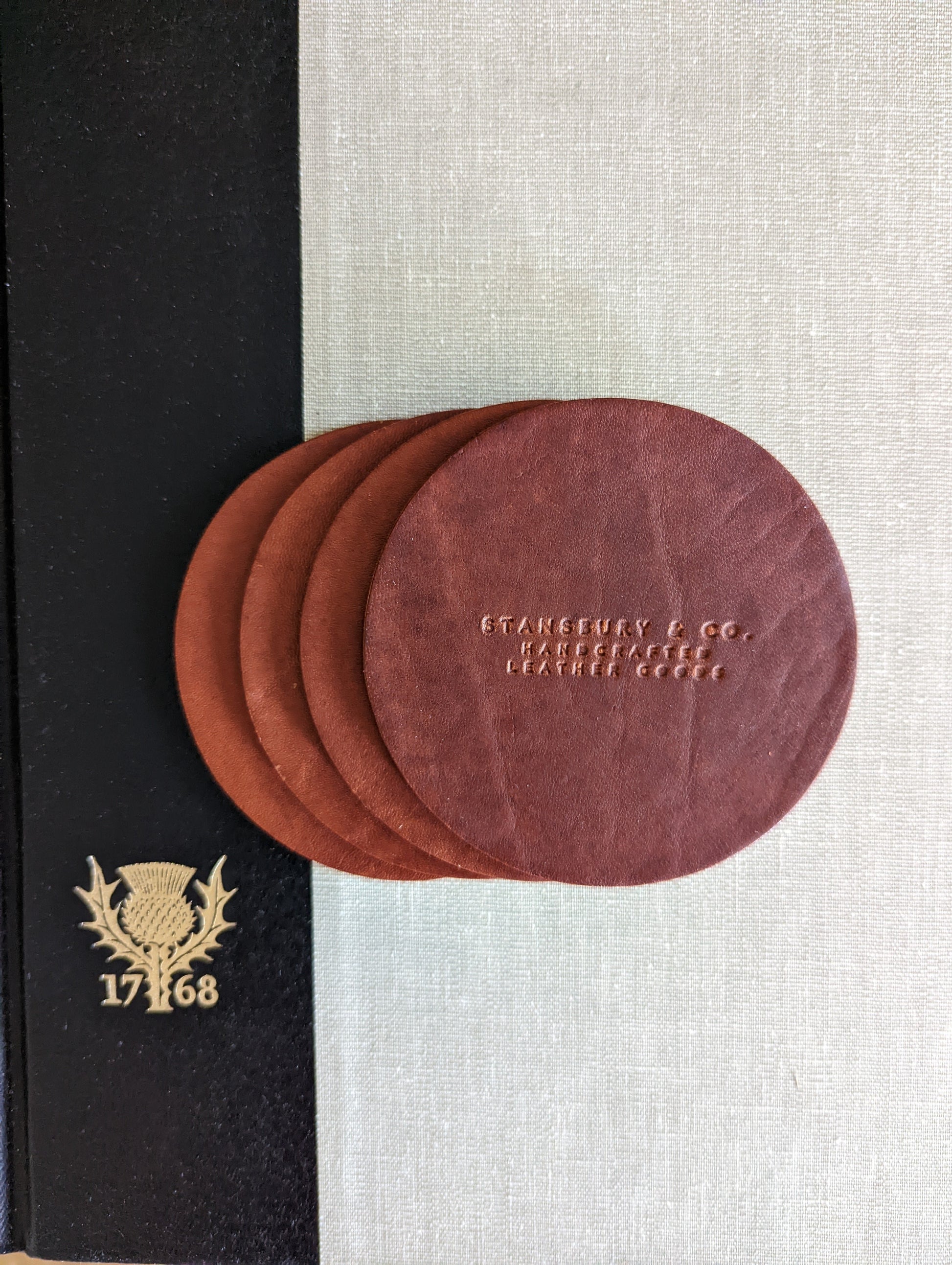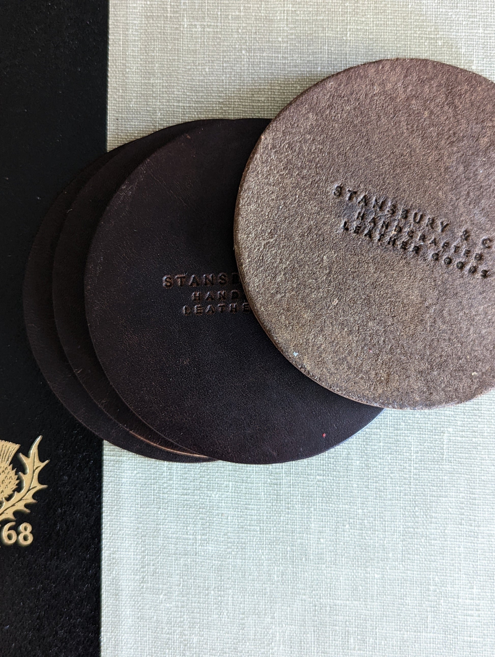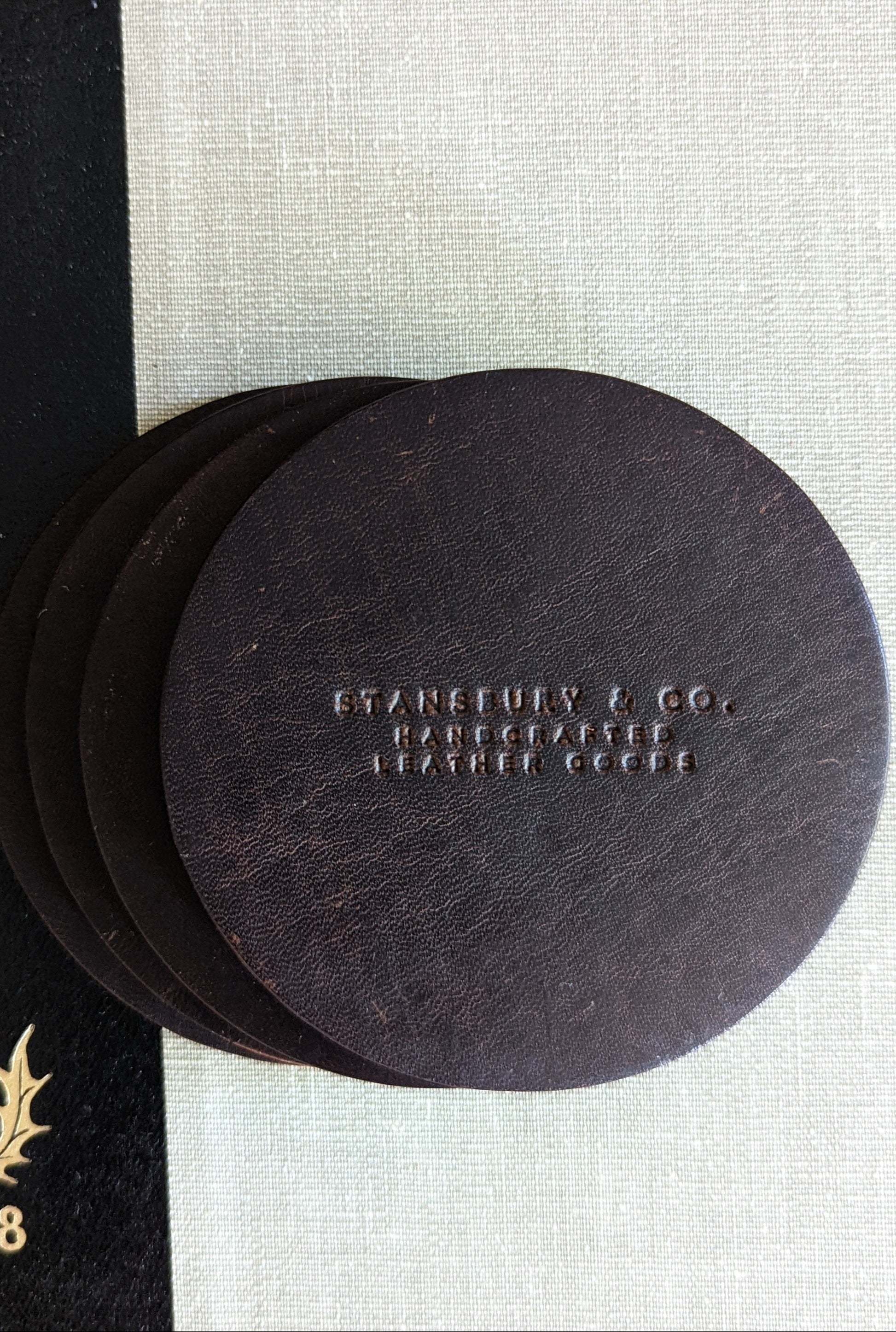 Our coasters are always hand-stamped on thick, water-resistant, full-grain leather, and will last for years to come.
