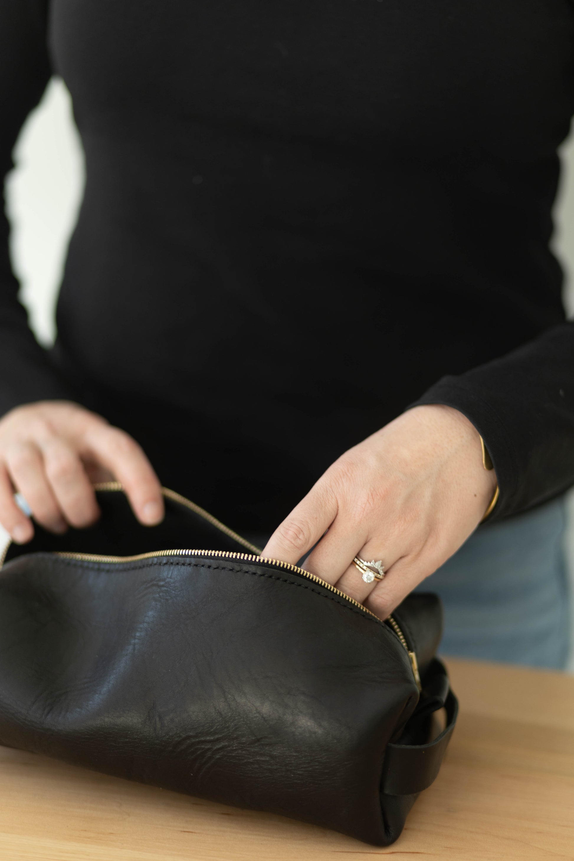 Carry your toiletries securely and in style with our handmade leather Dopp Kit. Grab and go with its side strap or throw it in your carry on. Keep your things organized in our classic take on a Dopp Kit and we promise it won't let you down on your many travels, near or far.